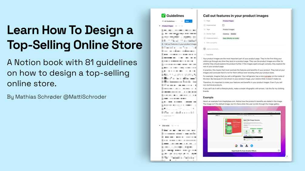 In this Notion handbook, you learn 81 guidelines for optimizing your store to sell the most. Optimizing your site makes all your other marketing work better. You get a higher return on paid ads, sell more from emails, and convert more organic traffic.